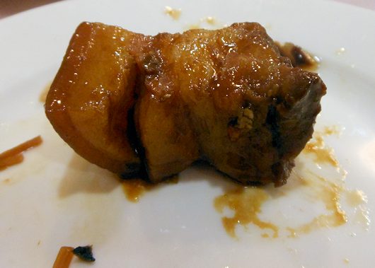 そして、上海料理の定番、紅焼肉です。 今日の一人夕飯のメインディッシュです。紅焼という調理法は醤油で煮込むという意味です。八角、棗や生姜を入れた醤油たれで長い時間煮込まれた肉は柔らかくて美味しいのです。この味付けもいかにも上海料理です。 一目見た瞬間に感じたことは、肉が少ないということです。それにしても、肉よりも乾豆腐(硬く作られた豆腐)をねじったものが随分と多いですね。乾豆腐はお腹にたまるので、肉を探り出して食べます。 |
