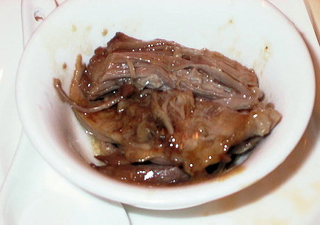 上海料理の冷菜というと、クラゲとか老上海飯店で食べた薫魚とかもありますが、私が好きなのは鎮江肴肉、豚もも肉の塩づけハムです。肉が腐ってはいけないので塩漬けして保存していた頃からの伝統料理です。この塩漬け肉を1~2日くらいの間、生姜、胡椒や八角などと一緒に煮込んで作ります。上の写真は深圳の江南厨子で食べたものです。鎮江は、蘇州から長江(揚子江)に沿ってさらに南京方面へ行ったところにある街で黒酢の産地としても有名ですが、その黒酢をつけて食べます。少し塩気が強く油っぽいくらいの味が私は好きです。 |