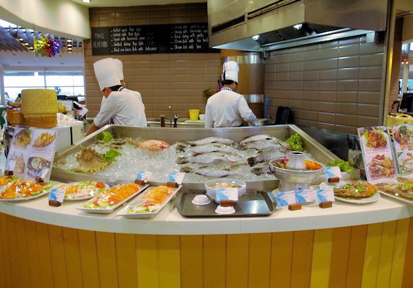 | 上の写真はタイ料理の店ですけれども、タイ料理の店もいくつかあります。このクーポン食堂のターゲットは観光客ですから、それぞれの店には必ず英語の話せる人はいるようです。それにメニューの実物や写真も店頭に飾られていますから、観光客にとってはありがたいレストランです。 |