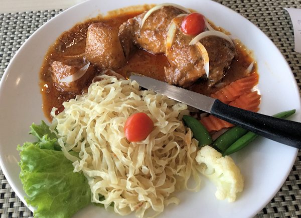 こちらはマッサマンカレー・バーミーヘン(汁なし麺)です。中華麺にマッサマンカレーを絡めながら食べます。マッサマンカレーに入っていた鶏肉が良く煮込まれていて、想定範囲を超えて結構おいしかったです。 カレーラーメンというとスープ麺しか食べたことがなかった私ですが、今回はスパゲティを食べている感覚で食べさせていただきました。これ、意外に美味しいです。おすすめです。 クーポン食堂で、これ美味しかったなあというように感じることは極めて稀です。ご興味があれば、皆さんもお試しください。ただ、私の好みからすると、こうしたクーポン食堂で食べるより、地元の人で賑わう惣菜食堂や惣菜屋台の方が好きです。私がパタヤで気に入っている惣菜食堂、デンダムはこちらです。マッサマン・チキンカレーは一度試す価値のある逸品です。 |