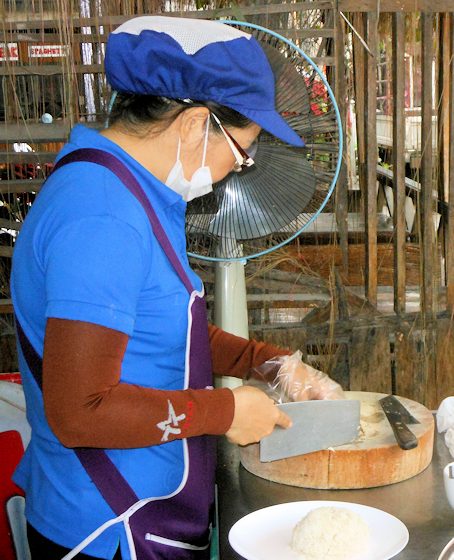入口ではお姉さんが鶏肉を切っていました。マスクをして、手にはビニール袋を巻いて、衛生状態がいいですね。朝7時半に行きましたが、このお姉さんともう一人の女性と二人体制でした。 |