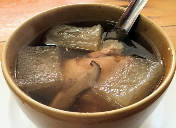 まず、ダックスープを紹介しましょう。テーブルに運んでもらうと、ダックの香りがしてきます。結構な量があって、お肉もたくさん入っています。でも、上の写真では大根が邪魔して、スープの中身があまり見えませんね。 |