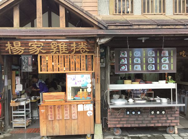 | 菁桐老街というのは駅前に50mほどしか続かない小さい街です。それでもさすがに台湾です。食べ物屋さんはいろいろ見つかります。これだけの人で賑わっていると、明るいうちに夜市に紛れ込んでしまったような感覚に襲われます。 上の写真は、右側が麺類の店、左側がチキンロールとご飯類のお店、どちらも興味がないわけではありませんが、もう少しランチの場所を探してみましょう。 |