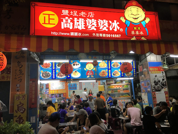 | 高雄でマンゴーかき氷と言えば、必ず名前が挙がるのがここ高雄婆婆冰です。高雄婆婆冰は地下鉄塩埕埔駅から徒歩5分くらいの場所にあって、夕食を食べた自強夜市 (苓雅夜市)からはバスで10分くらいの距離です。予め調べたところ、閉店は深夜24時ということなので、十分に間に合うとは思っていたものの、深夜までマンゴーかき氷を食べるお客さんなどいるのかなどと思っていたら、行ってみてびっくりです。満員盛況なのです。 |