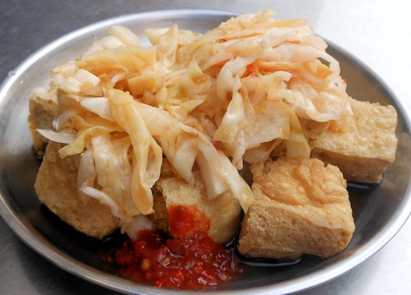 | おばちゃんも絶対の自信を持って臭豆腐をすすめてくれたので、試しに一皿食べることにしました。NT$30(日本円で約100円)です。おばちゃんの後ろに見えるエアコン付の食堂内で食べてっていいですよ、なんてことも言ってくれます。このおばちゃん、性格いいですね。 | |||