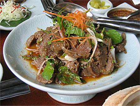 ソムタムの名門、ハイタイ料理の中でソムタムというと、もうこれは欠かせない定番料理です。ソムタムは、地方によって、さらには、家庭によっても味が違うそうです。日本では青パパイヤのサラダなどといわれていますが、むしろ、タイの漬物的位置づけの家庭料理だと考えれば良いと思います。そのソムタムの店として、シーロムで評判の店がコンベント通りの「ハイ」です。地元のサラリーマンで一杯になってしまう人気店ですが、それだけにソムタムは種類も多く味も最高です。値段もお手ごろで辛さは地元の人向けですから、私のお気に入りの店の一つなのです。 |
