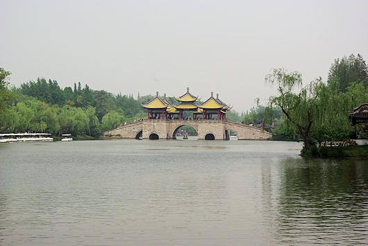 門をくぐると早速痩西湖らしい景色が目に飛び込んできます。 もともとは蛇行していた川を改造して湖のようにしたのが痩西湖で、乾隆帝が杭州の西湖を気に入っていたため、杭州の西湖に似せて造ったとも言われています。ただ、杭州の西湖よりも細長いので痩せた西湖ということで「痩西湖」と名づけられたとされています。遊覧船や石造りの太鼓橋などに杭洲の西湖の雰囲気を、いや失礼、痩西湖の雰囲気を感じさせます。 奥に見える橋は「二十四橋」といいます。橋は長さ24メートルで、幅2.4メートル、橋の両側にある階段はそれぞれ24段、橋の上には24本の白玉の手すりが24枚の石板を囲んでいます。「二十四橋」の名前の謂れがどの「24」なのかは諸説まちまちだそうです。 |